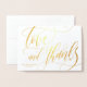 Lindo cartão de agradecimento de casamento com amor e agradecimento escrito em uma escrita espiralada, impresso com folha de ouro real. Adicione sua foto de casamento ao cartão de agradecimento com folha de ouro e uma nota de agradecimento personalizada.
