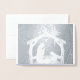 Linda cena de natividade de prata e azul com o três sábio e uma mensagem especial dentro desta Carta de Saudação dobrada. Folha de prata de luxo. Cartão de Natal.
