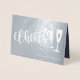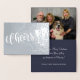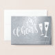 Personalizado, elegante e moderno branco dobrado, cinzas e escuridão da meia-noite azul de inverno saudação cartão prateado com caligrafia escova manuscrita Cheers script com duas flautas estilizadas de champanhe na frente e sua foto personalizada e seu dentro de texto de saudações. Personalize com sua foto, assinatura e texto!