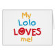 Meu Lolo me ama T-shirts, fatos-chave, cartas, adesivos, canecas, bolsas, ímanes e muito mais com um design de texto azul, vermelho e amarelo colorido.