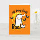 Este pequeno fantasma fofo com bochechas cor de laranja diz MEU PRIMEIRO BOO! Uma grande lua amarela e pequenos morcegos sorridentes fazem este adorável design perfeito para o seu primeiro Halloween. Em T-shirts de bebês e crianças, sacos de tote, cartões de saudação e muito mais! PinkInkArt original!