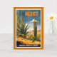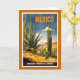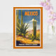Belo cartaz de viagem antigo para o México mostrando o deserto e cactos e uma pequena cidade ao fundo.