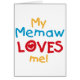 Meu Memaw me ama T-shirts, fatos-chave, cartas, adesivos, sacos para cartazes, ímanes, adesivos e outros Dons me ama, e me ama com um design de texto azul, vermelho e amarelo.