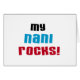 Minhas camisetas Nani Rocks, cartões, adesivos, sacos de tote, ímãs, botões e outros itens com um design de texto preto, azul e vermelho. Estes itens do My Nani Rocks são uma forma excelente de mostrar o seu amor pelo seu nani especial!