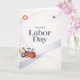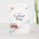This contemporary Labor Day design features clean typography and a refined, minimalist layout. The centered “Happy Labor Day” message is set against a soft, textured background with flowing linear accents that suggest movement and progress. Subtle industrial elements—a toolbox with hand tools and small gear icons—add a modern nod to craftsmanship and hard work without visual clutter. A calm palette of navy, soft gray, warm gold, and muted red creates a polished, professional feel.