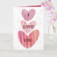 Cartão moderno do dia dos namorados. Apresentando 3 corações criados em aquarela numa gama de tons de vermelho a rosa num fundo branco com uma textura de respingos de aquarela. Dentro deste cartão há um grande coração com texto num fundo vermelho. Fácil de editar com o seu nome.