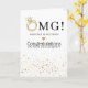 Parabéns elegantes no seu cartão de saudação de inscrição, apresentando um confete de coração dourado e um OMG! com o O como um anel de noivado. Use o noivado moderno para personalizar com nomes.