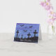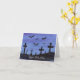 Uma pequena paisagem em aquarela de morcegos em voo sobre um cemitério à noite adorna este cartão assustador de Halloween. Personalize alterando o texto como quiser!
