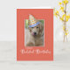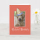 O cartão é para um aniversário atrasado e mostra um cão engraçado que recupera o ouro lambendo suas costeletas pensando no bolo de aniversário que sobrou. Excelente humorístico para dar ao amante do cão!