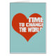 Um grande design gráfico cardíaco vermelho com a citação: hora de mudar o mundo