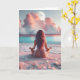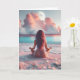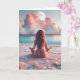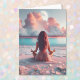 Mulher bonita meditando em uma praia de areia branca e vidro do mar brilhante. Nuvens fofas rosa e azul e água azul pálida.