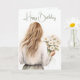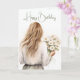 Mulher loira com um buquê de margarida em efeito de aquarela para o aniversário.