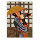 Renderização digital em 3D de uma bela mulher de batalha asiática num fundo de templo tradicional