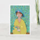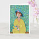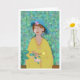 Mulher de Arte Moderna com vestido amarelo e chapéu azul segurando flores Dentro do texto diz Feliz Aniversário, mas este texto pode ser alterado para se adequar à sua mensagem