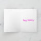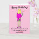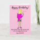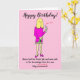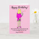 Cartoon engraçado de uma mulher que não cortou o cabelo desde o lockdown, segurando uma garrafa de vinho e uma taça de vinho para celebrar seu aniversário. A legenda diz 'Feliz Aniversário' e 'Nome tomou a vacina Covid e estava segura sabendo que estava totalmente intoxicada (Inoculada foi riscada)'. O cartão tem um fundo rosa e a mulher está usando um vestido rosa. É fácil personalizar este cartão editando o texto do modelo. Obrigado por visualizar meus desenhos de cartoon!