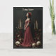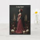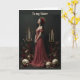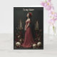 Uma mulher de vestido vermelho está entre crânios, com velas em ambos os lados, neste lindo cartão de aniversário gótico para uma irmã.