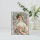 Envie como cartão de agradecimento ou para uma festa de primavera. Cartão-postal para qualquer ocasião. Este lindo design apresenta uma mulher vitoriana segurando várias rosas cor-de-rosa e suas folhas e caules soltos em seus braços. O fundo tem uma aparência abstrata em aquarela variada.