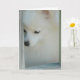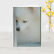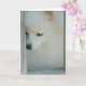 Photo greeting card with a white Pomeranian puppy dog looking down framed by wooded porch railing. Inside of card says "I miss you" in rope lettering. Fill in the text field to personalize or click on customize it to add/change font, size and/or color on inside or out. A sweet card for a child away at school or camp. © Little Wing Photography & Design