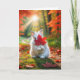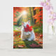 Um coelho branco fofo escondido atrás de uma folha vermelha de mapa vibrante contra o pano de fundo de um caminho de floresta iluminado pelo sol