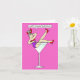 Um desenho animado divertido de uma senhora vestindo um traje roxo, sapatos vermelhos e penas vermelhas no cabelo. A senhora está reclinada em um copo de cocktail gigante, dizendo 'Feliz Dia dos Namorados' e a imagem está colocada contra um fundo cor de rosa brilhante.