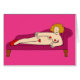 Uma senhora de desenho animado deitada sobre uma farsa e solitária vestindo apenas três corações vermelhos e um par de calçados vermelhos. A imagem tem um fundo cor-de-rosa profundo.