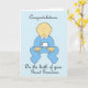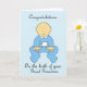 Um adorável menino de desenho animado vestido de azul e as palavras "Parabéns sobre o nascimento do seu Excelente neto".
