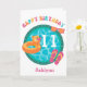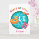 Cartão de aniversário personalizado de 11 de Verão para raparigas que apresenta um design colorido na frente do cartão com um chinelos de pato flutuativo, cor-de-rosa, óculos de sol e uma piscina. Você poderá personalizar facilmente o cartão com a idade de aniversário, o nome e a mensagem de dentro. Um cartão de aniversário de 11 de verão colorido personalizado para filha, neta etc.