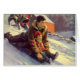 Imagem de Natal em Vintage, mostrando um pai e uma filha trenando uma colina coberta de neve no dia de Natal.