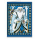 Vintage ilustration Christmas Santa Claus image apresentando o Santo Nicholas vestido num casaco azul segurando um globo de neve numa mão e segurando uma bengala na outra. Um ursinho de pelúcia pende de sua casaco e um saco de brinquedos está sobre suas costas.