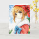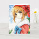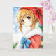 Cartão de Natal personalizado com um cabelo vermelho giro com uma menina de anime vermelha e uma dentro de arco surpresa de uma anime com chapéu de orelha de gato de inverno.