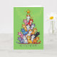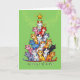 Pun Cartão de Natal para um amante de gato. Gatos coloridos, organizados como uma árvore de Natal com uma camada estrelada e fundo verde com as palavras "Catmas Feliz"