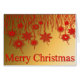 Uma saudação de cartão de Natal ouro, com um rastro de decorações de Natal vermelhas e estrelas penduradas sobre a mensagem de Feliz Natal.