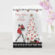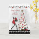 Cartão de Natal moderno para afilhada, apresentando uma senhora elegante vestida de vermelho com salto alto carregando presentes em direção a uma bela árvore de Natal branca decorada. Gráficos cedidos por Crave Designs.
