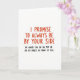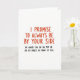 This greeting card has a plain white background and two lines of message-centered text. At the top and center, it says “I PROMISE TO ALWAYS BE BY YOUR SIDE” in large red handwritten-style letters that feel heartfelt and direct. Just below that, a smaller line in black reads, “OR UNDER YOU OR ON TOP OR ON MY KNEES IN FRONT OF YOU,” adding a cheeky twist. The contrast between the big red promise and the smaller black add-on makes the joke land quickly while still feeling affectionate. There are no characters or objects here—just the words—so your attention stays on the message and the relationship behind it. Overall, it’s a flirty, funny Valentine option that’s meant for someone who will laugh and blush at the same time ❤️