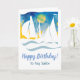 Personalize este cartão de aniversário náutico legal para o seu marinheiro (ou qualquer pessoa) ... Aniversário, Aniversário de Casamento, Dia dos Pais ou qualquer ocasião especial. Design geométrico abstrato com silhuetas de barcos à vela nas ondas do oceano azul com lua cheia.
