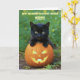 Um gatinho preto com suas patas descansando sobre um sorridente e sorridente Jack O' Lantern — uma maneira perfeita de enviar os desejos de Halloween para sua sobrinha!