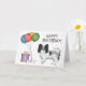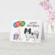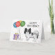 A ilustração original do desenho de Destei de um cão da raça Papillon, casaco preto e branco. Ao lado do cão há balões coloridos de aniversário amarrados num osso de cão e uma caixa de cor roxa e amarela. O fundo tem um padrão lúgubre de confete pastel colorido sobre um fundo branco. Há também uma área de texto personalizável que agora diz: "Feliz aniversário!".