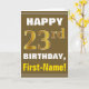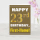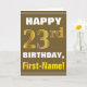 Este simples design de cartão de saudação com tema de aniversário apresenta um desejo de aniversário quente como "FELIZ 23º ANIVERSÁRIO, Primeiro Nome!" na frente, em texto a negrito sobre um fundo castanho. O número de aniversário tem uma aparência falsa e imitada de cor dourada. O nome na frente pode ser personalizado. O dentro apresenta uma mensagem de aniversário que pode ser personalizada. Um cartão de boas-vindas como este poderia ser uma maneira divertida de fazer votos de aniversário a alguém que comemora seus vinte e três anos. [~Z0000281]