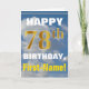 Este simples design de cartão de saudação com tema de aniversário apresenta um desejo quente de aniversário como "HAPPY 78th BIRTHDAY, First-Name!" na frente, em texto a negrito sobre um fundo que mostra um céu azul com nuvens brancas e cinzas. O número de aniversário tem uma aparência falsa e imitada de cor dourada. O nome na frente pode ser personalizado. O dentro apresenta uma mensagem de aniversário que pode ser personalizada. Um cartão de saudação como este poderia ser uma maneira divertida de fazer votos de aniversário a alguém que comemora seus setenta e oito anos. [~Z0000284]