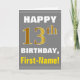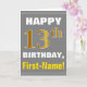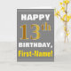 Este simples design de cartão de saudação com tema de aniversário apresenta um desejo de aniversário quente como "FELIZ 13 BIRTHDAY, First-Name!" na frente, em texto a negrito em um fundo de cinza (cinza) colorido. O número de aniversário tem uma aparência falsa e imitada de cor dourada. O nome na frente pode ser personalizado. O dentro apresenta uma mensagem de aniversário personalizável. Uma carta de boas-vindas como esta poderia ser uma maneira divertida de fazer votos de aniversário a alguém que comemora o seu décimo terceiro aniversário. [~Z0000283]