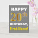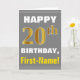 Este simples design de cartão de saudação com tema de aniversário apresenta um desejo de aniversário quente como "FELIZ 20 BIRTHDAY, First-Name!" na frente, em texto a negrito em um fundo de cinza (cinza) colorido. O número de aniversário tem uma aparência falsa e imitada de cor dourada. O nome na frente pode ser personalizado. O dentro apresenta uma mensagem de aniversário personalizável. Um cartão de boas-vindas como este poderia ser uma maneira divertida de fazer votos de aniversário a alguém que comemora seu vigésimo aniversário. [~Z0000283]