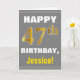 Esta simples design de cartão de saudação com tema de aniversário apresenta um desejo de aniversário quente como "FELIZ 47º ANIVERSÁRIO, Jessica!" na frente, em texto em negrito em uma cinza (cinza) de fundo colorido. O número de aniversário tem uma aparência falsa e imitada de cor dourada. O nome na frente pode ser personalizado. O dentro apresenta uma mensagem de aniversário que pode ser personalizada. Um cartão de boas-vindas como este poderia ser uma maneira divertida de fazer votos de aniversário a alguém que comemora seus quarenta e sete anos. [~Z0000283]