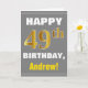 Este simples design de cartão de saudação com tema de aniversário apresenta um desejo quente de aniversário como "FELIZ 49º ANIVERSÁRIO, Andrew!" na frente, em texto a negrito em uma cinza (cinza) de fundo colorido. O número de aniversário tem uma aparência falsa e imitada de cor dourada. O nome na frente pode ser personalizado. O dentro apresenta uma mensagem de aniversário personalizável. Um cartão de boas-vindas como este poderia ser uma maneira divertida de fazer votos de aniversário a alguém que comemora seus quarenta e nono anos. [~Z0000283]