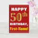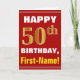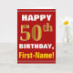 Este simples design de cartão de saudação com tema de aniversário apresenta um desejo de aniversário quente como "HAPPY 50th BIRTHDAY, First-Name!" na frente, em texto em negrito sobre fundo de cor vermelha. O número de aniversário tem uma aparência falsa e imitada de cor dourada. O nome na frente pode ser personalizado. O dentro apresenta uma mensagem de aniversário que pode ser personalizada. Um cartão de boas-vindas como este poderia ser uma maneira divertida de fazer votos de aniversário a alguém que comemora o seu quinquagésimo aniversário. [~Z0000276]