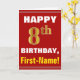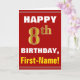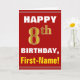 Este simples design de cartão de saudação com tema de aniversário apresenta um desejo de aniversário quente como "FELIZ 8º ANIVERSÁRIO, Primeiro Nome!" na frente, em texto a negrito sobre um fundo de cor vermelha. O número de aniversário tem uma aparência falsa e imitada de cor dourada. O nome na frente pode ser personalizado. O dentro apresenta uma mensagem de aniversário personalizável. Um cartão de boas-vindas como este pode ser uma maneira divertida de fazer votos de aniversário a alguém que comemora seu oitavo aniversário. [~Z0000276]