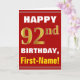 Este simples design de cartão de saudação com tema de aniversário apresenta um desejo de aniversário quente como "FELIZ 92º ANIVERSÁRIO, Primeiro Nome!" na frente, em texto a negrito sobre fundo de cor vermelha. O número de aniversário tem uma aparência falsa e imitada de cor dourada. O nome na frente pode ser personalizado. O dentro apresenta uma mensagem de aniversário personalizável. Um cartão de boas-vindas como este poderia ser uma maneira divertida de fazer votos de aniversário a alguém que comemora o seu nonagésimo segundo aniversário. [~Z0000276]