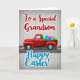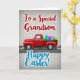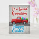 Este cartão apresenta uma camionete crimson clássica mostrada de perfil, colocada contra uma parede de tijolos cinza claro levemente texturizada, rolando ao longo de uma estrada escura marcada com traços brancos curtos. No leito da camionete, há uma pilha de formas de ovos superdimensionadas em verde lima, azul brilhante e magenta, algumas com listras finas e um brilho brilhante 🐰. A cena parece amigável e afetuosa, como uma pequena surpresa sendo entregue, com a camionete inclinada para frente como se estivesse indo direto para alguém especial. Perto do topo, a linha “Para um Neto Especial” aparece em letras vermelhas com um contorno branco fino, centralizado acima da obra de arte. Perto da parte inferior, “Feliz Páscoa!” é colocado em grande tamanho em turquesa com um contorno branco, destacando-se fortemente contra o fundo neutro 🌷. O caminhão vermelho rico contrasta com os ovos pastéis, dando a toda a composição um visual festivo sem parecer atulhado. O padrão de tijolos pálidos permanece suave e uniforme por trás de tudo, deixando a camionete, os ovos e as letras permanecerem