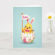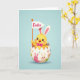 This card features a soft blue background that sets a calm spring setting, with a round yellow baby bird character peeking from a cracked eggshell. The little character has long bunny-like ears with pale pink inner details, and its wide dark eyes and rosy cheeks give it a tender, friendly look 🐰. A magenta bow tie sits neatly at its neck, adding a sweet, dressed-up touch beside its open beak shaped into a smile. The eggshell below acts like a cozy cradle, decorated with tiny long-eared figures and scattered colorful shapes that suggest a festive day. In one small wing, it holds a white pennant flag where the word “Easter” appears in bright pink lettering near the center of the flag 🐇. Soft, diffused lighting creates gentle shadows under the shell and along the character’s rounded body, giving the scene a lightly dimensional feel. The overall palette blends yellow, pink, and blue in smooth transitions that keep the focus on the character and its flag. The cracked shell shows jagged edges with patterned sections wrapping around the lower half.