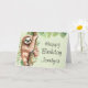 Aniversário com uma design de aquarela fofinha, com uma preguiça fofinha pendurada num galho arbóreo rodeado por folhas tropicais verdes. Uma fronteira de folhas tropicais verdes ao longo do topo. Fundo verde-oliva claro.