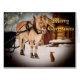 Foto com efeito de tinta. Noite de Natal com estrelas no céu. Um cavalo em frente a uma manga esperando por alguém, Papais noeis talvez? Numa fazenda ao ar livre com neve e coelhos correndo livremente no pátio. Um coelho está de pé em dois pés e "falando" com o cavalo. Espaço para você escrever à mão dentro. Letras amarelas claras e o texto: carimbos Feliz de Natal, disponíveis.